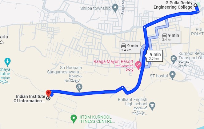 IIITDM Kurnool campus is located at Dinnedevarapadu Village, on a hilltop called “Jaganathagattu" in Kurnool district of Andhra Pradesh, close to the Nandyal-Kadapa Highway. The campus is about 12 KMs from Kurnool City Railway station, and 3 KMs from G. Pulla Reddy Engineering College, Kurnool. One could get an auto from the Railway Station/Bus Station to IIITDM Kurnool. The autorickshaw will charge approximately between Rs. 200-300. The important landmark in between Kurnool City and IIITDM Kurnool are 1. C-Camp 2. G. Pulla Reddy Engineering College 3. Nandyal Check Post and 3. Jaganathagattu temple. IIITDM Kurnool is located at approximately 50 meters from Jaganathagattu temple.